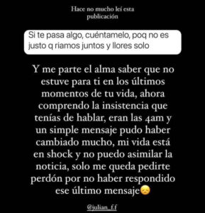 En su mensaje, la amiga de Julián Figueroa lamentó no haber respondido a la llamada del cantante. «Me parte el alma saber que no estuve para ti en los últimos momentos de tu vida», agregó Mar en su publicación.